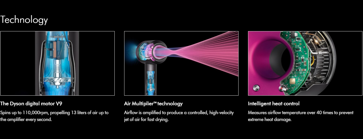 WHAT IT IS:The hair dryer re-thought. Helps prevent extreme heat damage to protect natural shine. Air temperature is measured 40 times every second, keeping the temperature under control. Ultra fast drying. Drying shouldn't take forever. For fast drying you need controlled, high velocity airflow.WHAT IT DOES:Fast drying: The small, powerful Dyson digital motor V9 combined with Air Multiplier technology produces a high-pressure, high-velocity jet of controlled air for fast drying and precision styling. Intelligent heat control: The Dyson Supersonic hair dryer measures air temperature over 40 times a second and regulates heat. This prevents extreme heat damage and help protect your hair's shine.test how to use itIncluded: Diffuser, Styling Concentrator, Gentle Air Attachment, Flyaway Attachment, Wide-tooth Comb.9.6"Lx3.8"Wx3.1"HModel Number - 885609025421Powerful Dyson digital motor V9 | Three magnetic styling tools | Designed for fast drying | 3 precise speed settings | 4 precise heat settings | Magnetic attachmentsCosmopolitan's Readers' Choice Beauty Award Winner 2023Cold shot - 82°F cold shot, to set your hair after stylingImported -